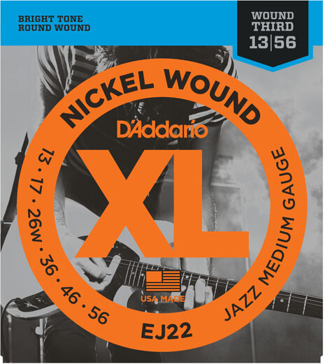 EJ22, D'Addario's heaviest gauge "jazz" set, is preferred for its wound 3rd/G string, dense tone and tight feel. Can also be used for down tuning.