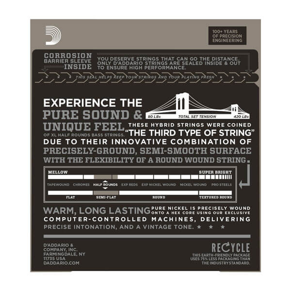 D'Addario Half Round bass strings are wound with pure nickel, then precision ground, leaving the outer surface smooth and semi-flat while retaining the flexibility of round wound strings. D'Addario's exclusive heat treating process ensures that Half Rounds retain their round wound brightness and sustain.