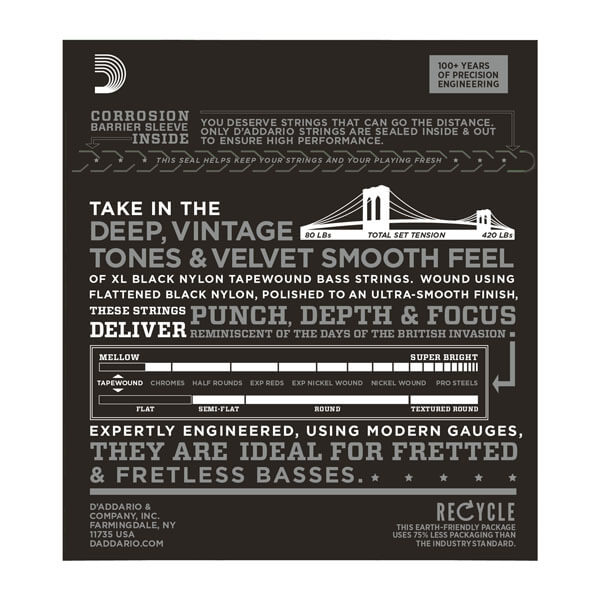 Engineered to provide optimal tension and gauged to fit properly on standard bass saddles and nutsFlattened black nylon wound for a warm, deep toneFits long scale basses with a string scale length of up to 36 1/4 inchesMade in the U.S.A. for the highest quality and performanceString Gauges: Wound .050, .065, .085, .105Environmentally friendly, corrosion resistant packaging for strings that are always fresh