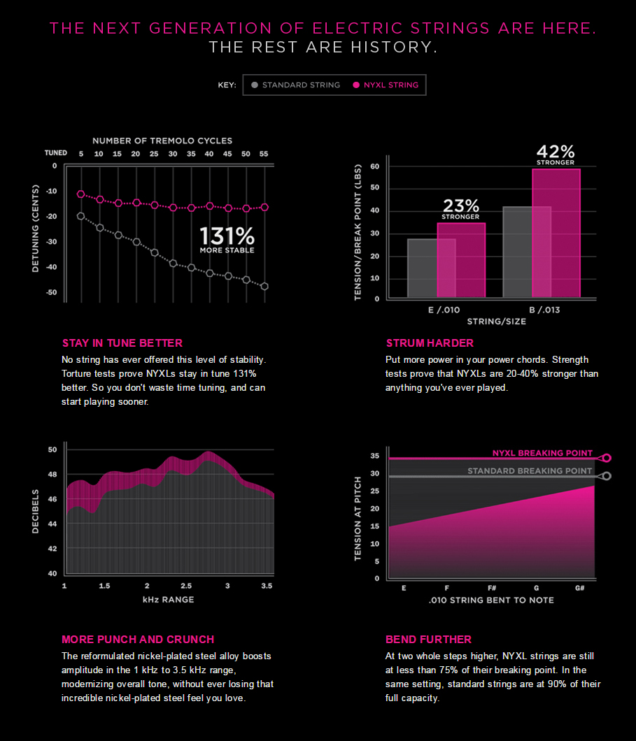 D’Addario NYXL gitar telleri daha rahat bend yapacak, daha yüksek sesle şarkı söyleyecek ve daha önce çaldığınız tüm tellerden daha iyi akortlanacaktır. New York'ta D’Addario tarafından tasarlanan, mükemmelleştirilen ve üretilen bu yeni tasarlanmış, kırılmaya dayanıklı, yüksek karbonlu çelik çekirdek ve düz çelik alaşım teller, yeni bir özgürlük, güven ve güç seviyesi sunar. NYXL'ler, yassı çelikler için devrim niteliğinde bir “füzyon büküm” işlemi ile bir araya getirilmiş tamamen bir tel çekme işleminden yararlanarak daha fazla güç ve %131'e kadar daha fazla akort kararlılığı sağlar.