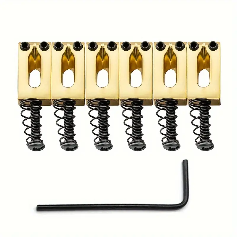 Bu 10.5 mm aralıklı alüminyum tremolo köprü saddle seti, elektrik gitarlar için yüksek hassasiyetli akort dengesi sağlar. Hafif yapısı sayesinde titreşim iletimini artırır, sustain performansını yükseltir. Altın renkli anodize yüzeyi estetik bir görünüm sunarken paslanmaz çelik yay ve vida sistemi uzun ömürlü kullanım sağlar. Set, 6 adet saddle ve montaj anahtarı ile birlikte gönderilir.