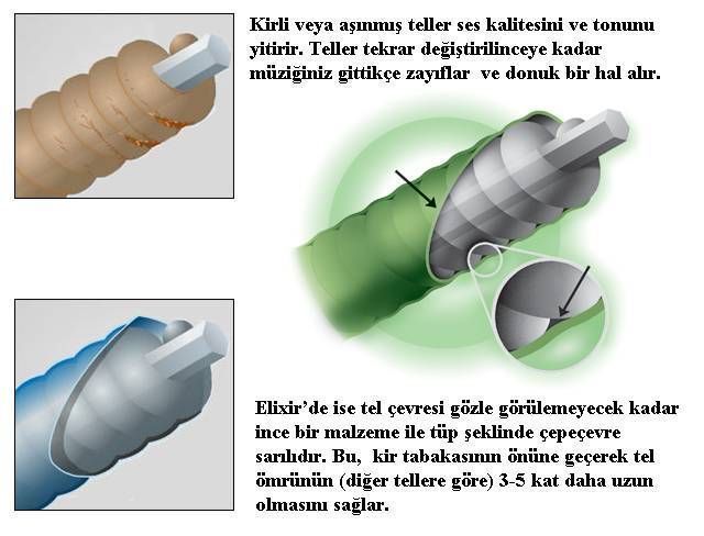 Elixir® tellerindeki bu özel teflon bazlı kaplama, telleri,ter, rutubet, paslanma, kirlenme, metal yorgunluğu gibi etkilerden tellerinizi korumaktadır. Bu uygulama sayesinde Elixir® tellerinin ömrünün, diğer normal tellerin ömründen 3 ila 5 kat daha uzun olduğu görülmüştür. Yani normal şartlarda neredeyse 5 takım tel değiştirdiğimiz süreci tek bir takımElixir® tel kullanarak geçirebiliriz. Ayrıca Elixir® tellerinin, çalım sırasında el teması ile gerçekleşen gürültüleri de diğer tellere göre minimuma indirdiği görülmüştür. Bu faktör özellikle stüdyo müzisyenlerinin Elixir® tellerini tercih etmesinde önemli bir faktördür.