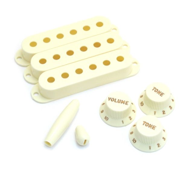 Includes vintage white tone and volume knobs, pickup covers, tremolo arm tip and switch tip (backplate sold separately)
