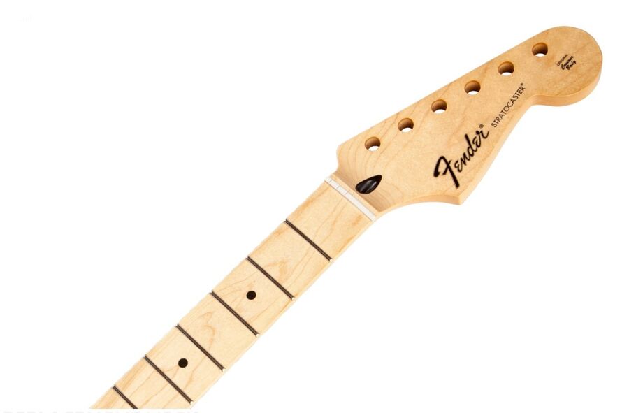Crafted at our Ensenada, Mexico, manufacturing facility, this genuine Fender Stratocaster® guitar maple neck features a comfortable "modern C" profile and 9.5"-radius maple fingerboard with 21 medium jumbo frets.The nut is pre-slotted with "pilot" string location grooves to make spacing a breeze when performing the final string slot filing, and a satin finish on the back offers smooth playability. For true Fender authenticity, it's also serialized and stamped, with genuine "Original Contour Body" headstock decal.This replacement neck is for a Fender or Squier® by Fender guitar.Because Fender genuine replacement necks have not been mounted to guitar bodies, nut slots must be cut by qualified personnel. Other installation processes may be required, such as fret work, fitting the neck to the neck pocket, and other instrument setup procedures. Your local FMIC Authorized Service Center can install genuine replacement necks; findAuthorized Service Centerlocations near you in the “Support” section of fender.com. FEATURES
