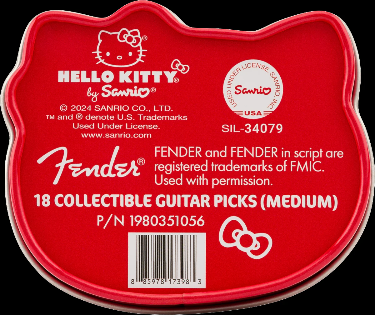 Hello Kitty şeklindeki koleksiyoncu kutusu, Fender x Hello Kitty tasarımıyla 18 orta sertlikte selüloit penayı bir araya getiriyor. Geleneksel 351 şekline sahip bu penalar, sıcak ve yuvarlak bir ton sunarken, her biri özel Hello Kitty motifleriyle süslenmiştir. Şık ve yeniden kullanılabilir bu pena kutusu, hem işlevsel hem de göz alıcı bir aksesuar olarak öne çıkıyor.