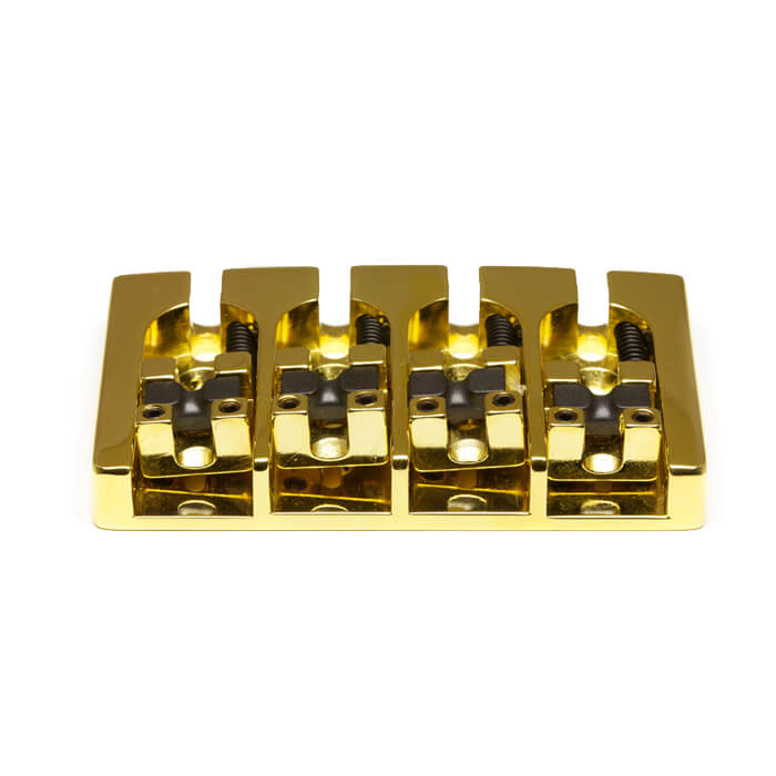 is a gold four string ghost loaded HipShot A-style bass bridge assembly with a 0.750" string spacing.