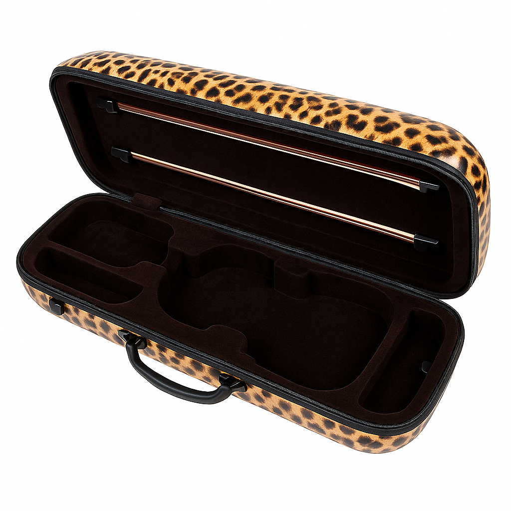 Kinglos leopar desenli sert keman çantası, sağlam plastik gövdesi ve kadife kaplı iç yapısıyla kemanınızı darbelerden güvenle korur. 2 yay için özel bölme ve aksesuar cebi ile kullanışlıdır. 4/4 keman uyumlu, hafif ve şık bir tasarıma sahiptir.
