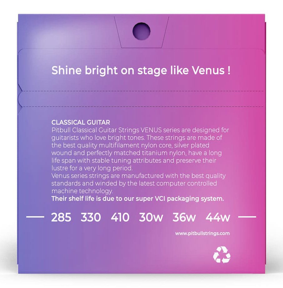 Pitbull Venüs Serisi Klasik Gitar Telleri, gümüş kaplı sarımlar ve Titanyum Nylon tiz tellerden oluşur.Sarımlı tellerdeki ipeksi nano kaplama teknolojisi sayesinde, normal tellere göre kararmalara karşı çok dayanıklıdır. Uzun ömürlü ve parlak tınılı teller arıyorsanız, Venüs serisi tam size göre!